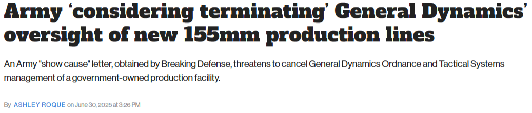 The Army has formally notified General Dynamics Ordnance and Tactical Systems that their management of the facility is being reviewed for breach of contract. They have until July 10 to detail how they might be able to get things back on track.