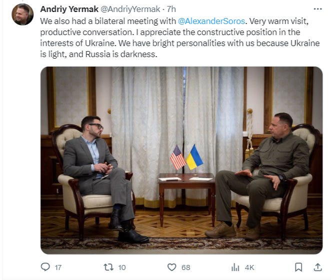 Just today, on his official Twitter account Yermak, who is also Jewish, announced his meeting with George Soros’ son, who now runs the Soros empire: