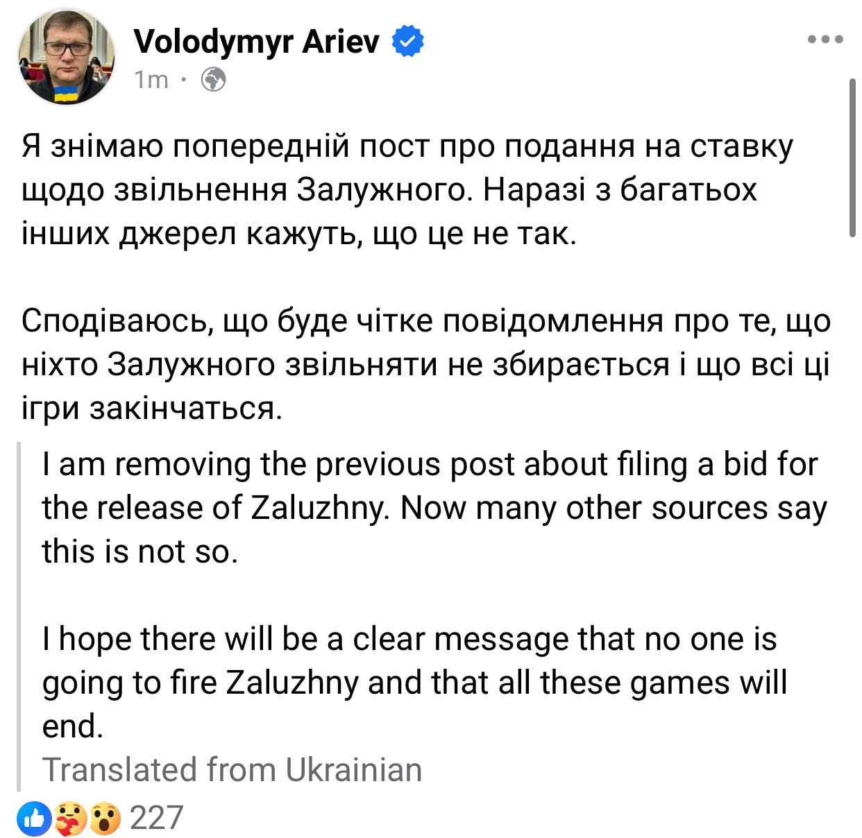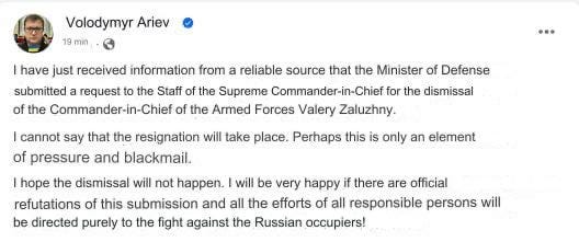 Then there was the post from Ukrainian parliament member Volodymyr Ariev which outright said that the president’s office has issued a decree to dismiss Zaluzhny from his Commander-in-Chief position: