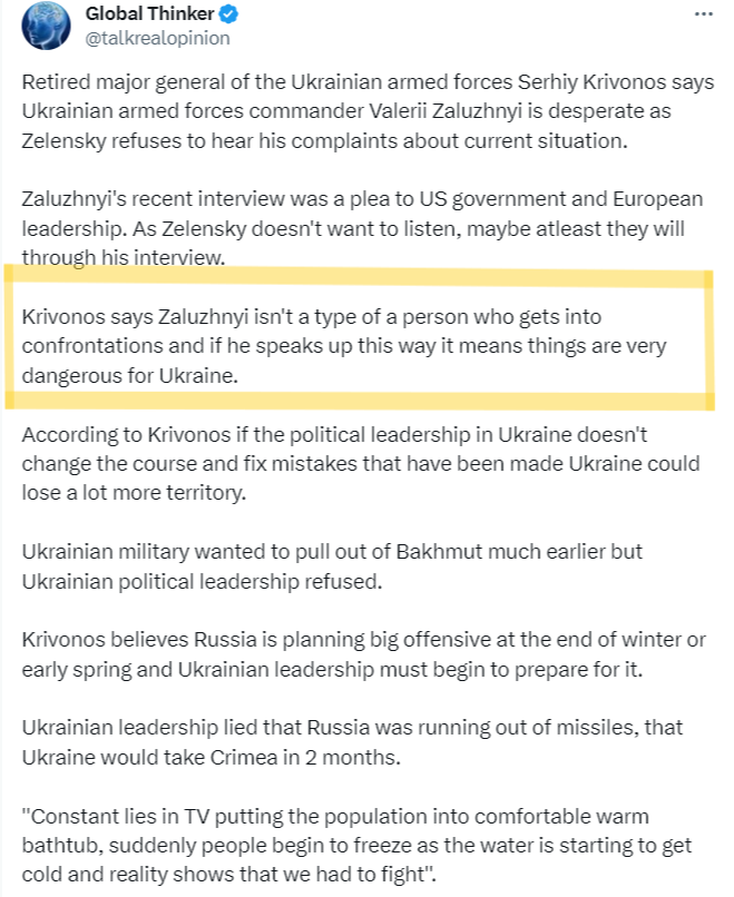 Now, there have been increasing rumors of major friction between Zelensky and the general staff, echoing Bakhmut intrigues. Zaluzhny wanted to retreat from Avdeevka, viewing the meatgrinder as a pointless drain on manpower.