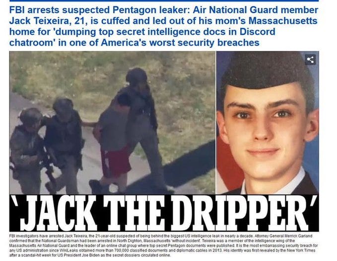 Jack Teixeira, 21 year old national guard member, was arrested at his home by a large special forces-looking outfit while he was apparently doing his homework on the back patio.