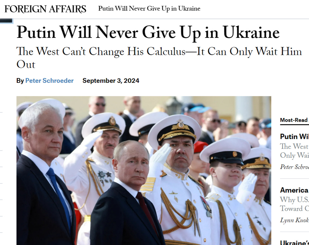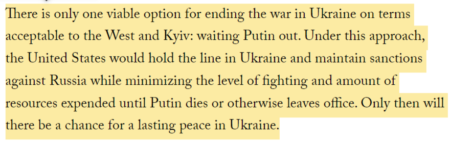 In essence, it states that Putin is “all in” and the only way to defeat him is try to prolong the fight as long as humanly possible until he “dies”—presumably of natural causes:
