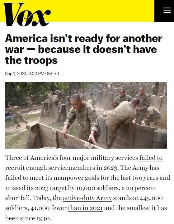 Three of America’s four major military services failed to recruit enough servicemembers in 2023. The Army has failed to meet its manpower goals for the last two years and missed its 2023 target by 10,000 soldiers, a 20 percent shortfall. Today, the active-duty Army stands at 445,000 soldiers, 41,000 fewer than in 2021 and the smallest it has been since 1940.