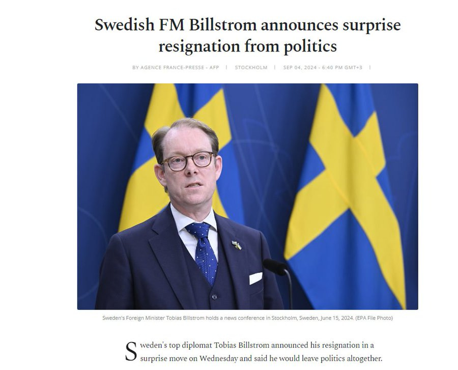 "It is with a mixture of sadness and pride that I have today informed the prime minister that I will leave the post of foreign minister at the opening of parliament next week," Billstrom, a member of the conservative Moderate Party, said in a post on X.