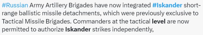 In fact, Russia has been utilizing Iskanders an extreme amount lately, which ties with the report from last time that Iskanders have been brought down to the brigade level, and now brigade commanders can order their own direct strikes without going up to divisional HQ or higher.