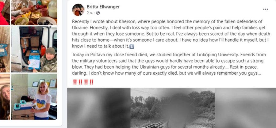 She mentions the Swedish instructors, which are at the center of the story. This was validated by a post from a woman who says her mate from Sweden’s Linkoping University perished in the Poltava attack: