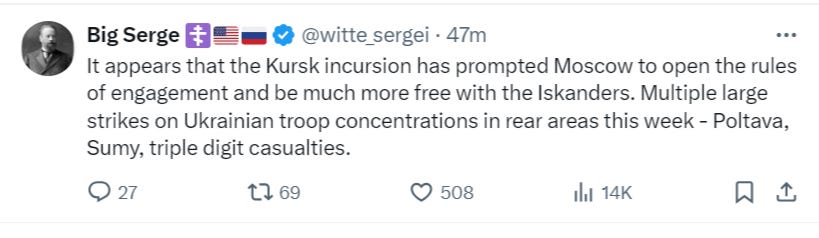 It seems more and more evident that Zelensky’s plan did in fact amount to simply taking some of Kursk and hoping that Russia would immediately sue for negotiations favorable to Ukraine to end the war. Of course, the true trump card that would have ensured such a plan was capturing the Kursk nuclear plant, which they failed to do.