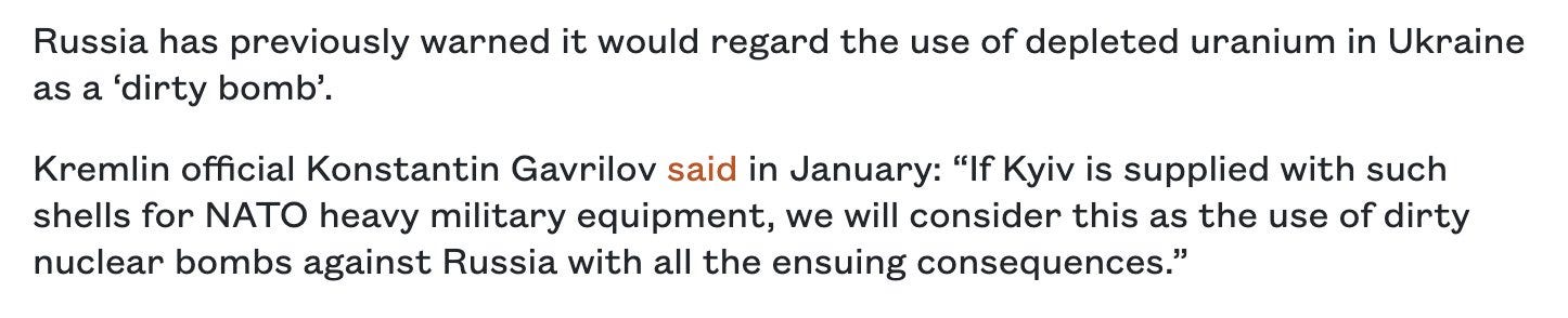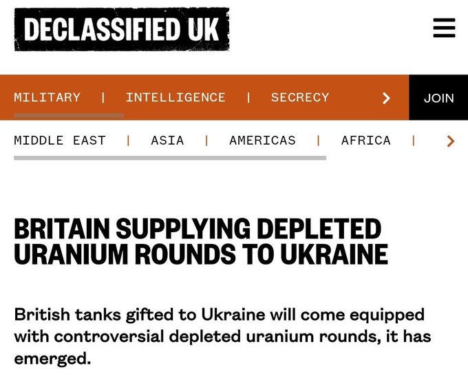 Firstly, there’s the topic of DU—depleted uranium. Britain has announced that it will be supplying DU penetrator rods along with its Challenger-2 tanks. As you know, with my analysis, I always strive to uncover the small unspoken things under the hood, the angles that the more ‘mainstream’ narratives fail to see, acknowledge, or understand.