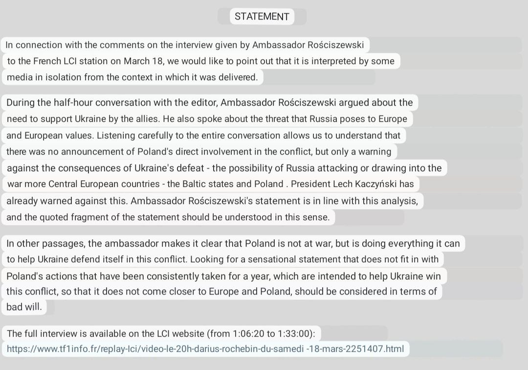 One addendum I wanted to make on the last writeup, apropos the issue of Polish re-armament and slow-march towards war. I forgot to include the recent statement, which has generated much buzz and controversy, from the Polish ambassador to France who, on a French television show, stated that if Ukraine loses, Poland will have to ‘enter the war’.