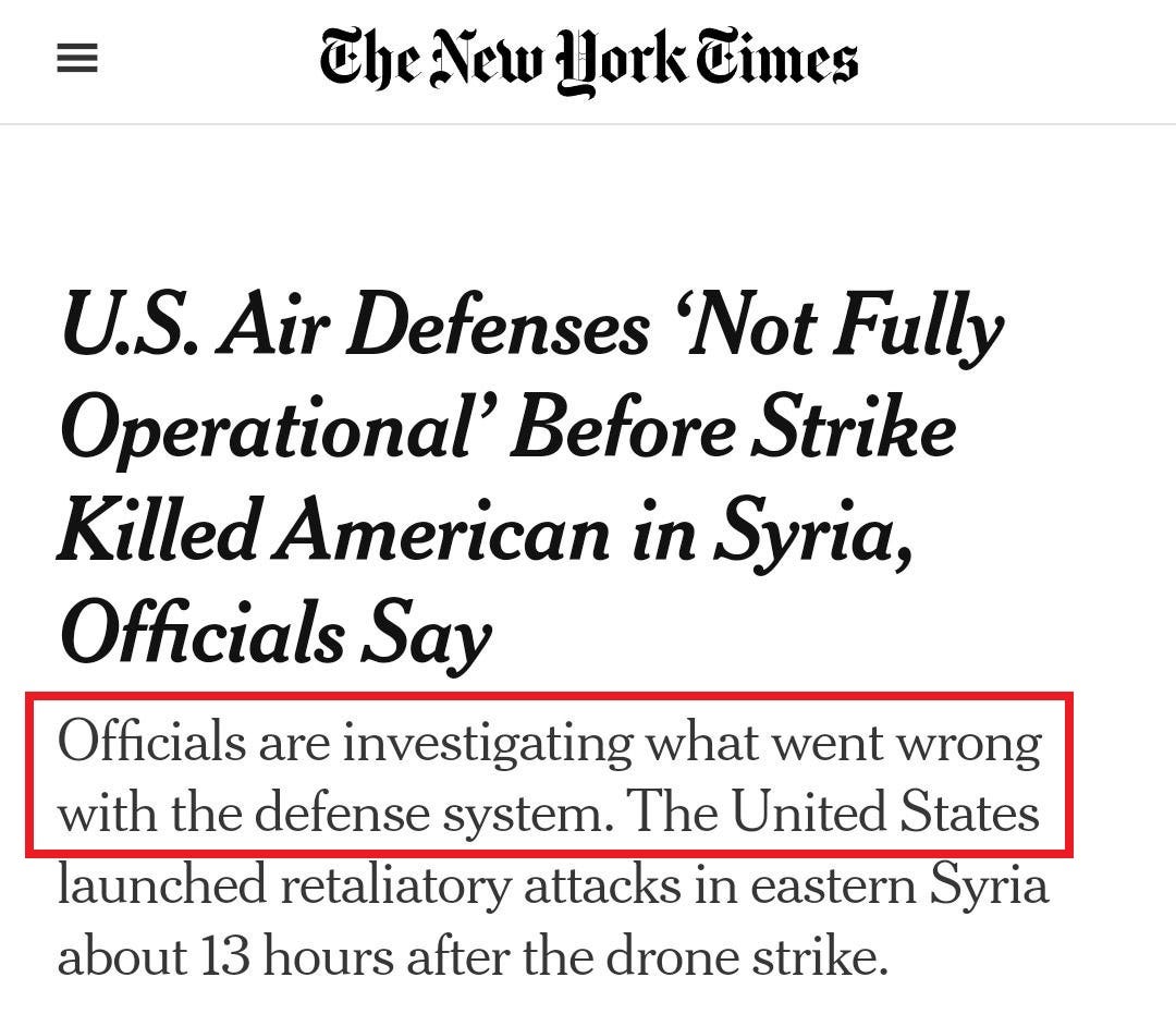 This is very interesting in light of the fact that just two days ago an American base was hit by cheap Iranian drones, with casualties. U.S. is now scrambling to find out ‘what went wrong’ with their vaunted air defense systems: