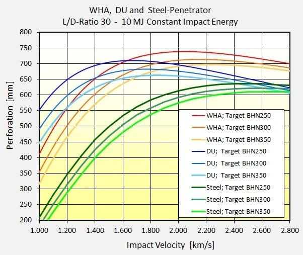 A table like the one below shows that WHA (90% Tungsten alloy) actually penetrates better than DU with certain variables and velocities in place. But the bottom line to understand is that DU penetrates far better than regular steel-tipped rounds, and is much cheaper to make than Tungsten.