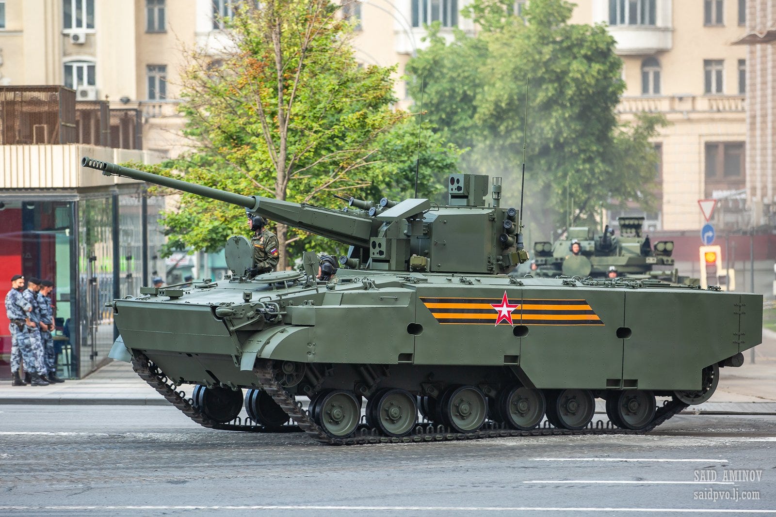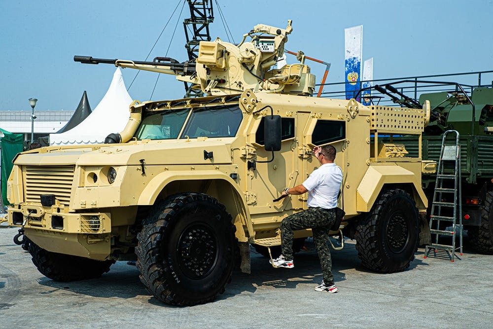 Among them is a new module based on the Typhoon-VDV chassis, which itself has recently been seen with the new BMD-30-D ‘Spitsa’ 30mm modules. The new anti-drone module, however, combines a 23mm Zu-23 autocannon with a fierce 2000rpm fire rate, and advanced sensors and computer systems for accurately correcting and automating the fire.