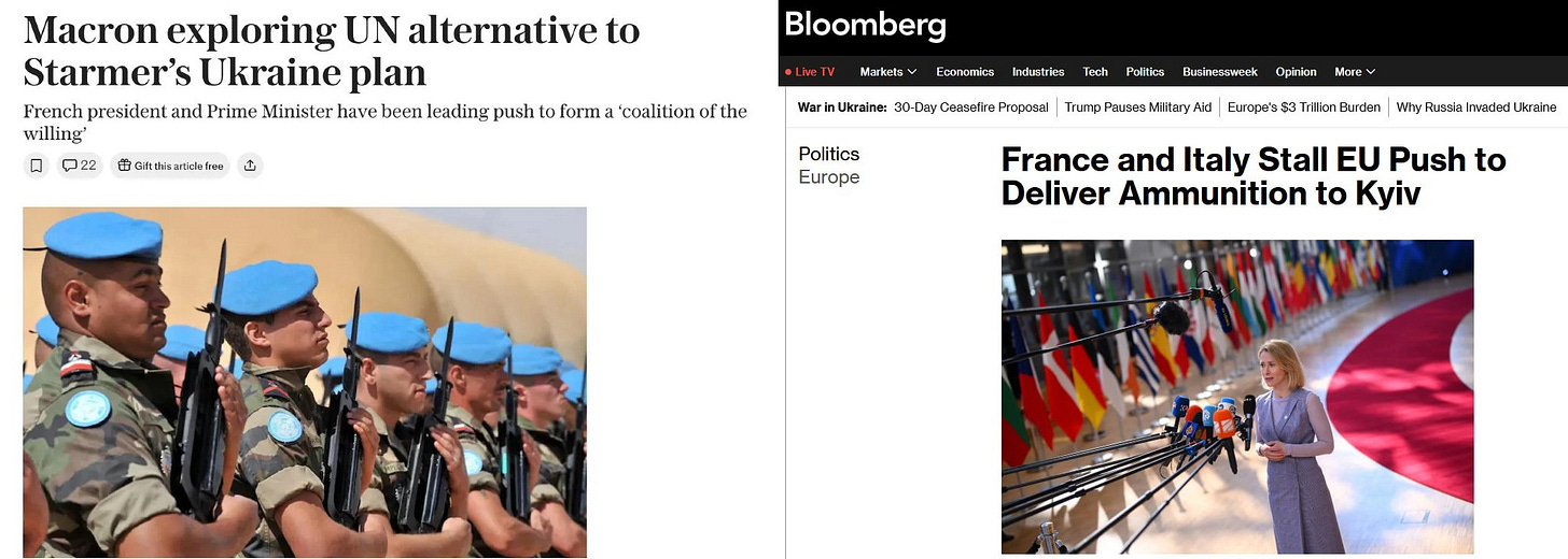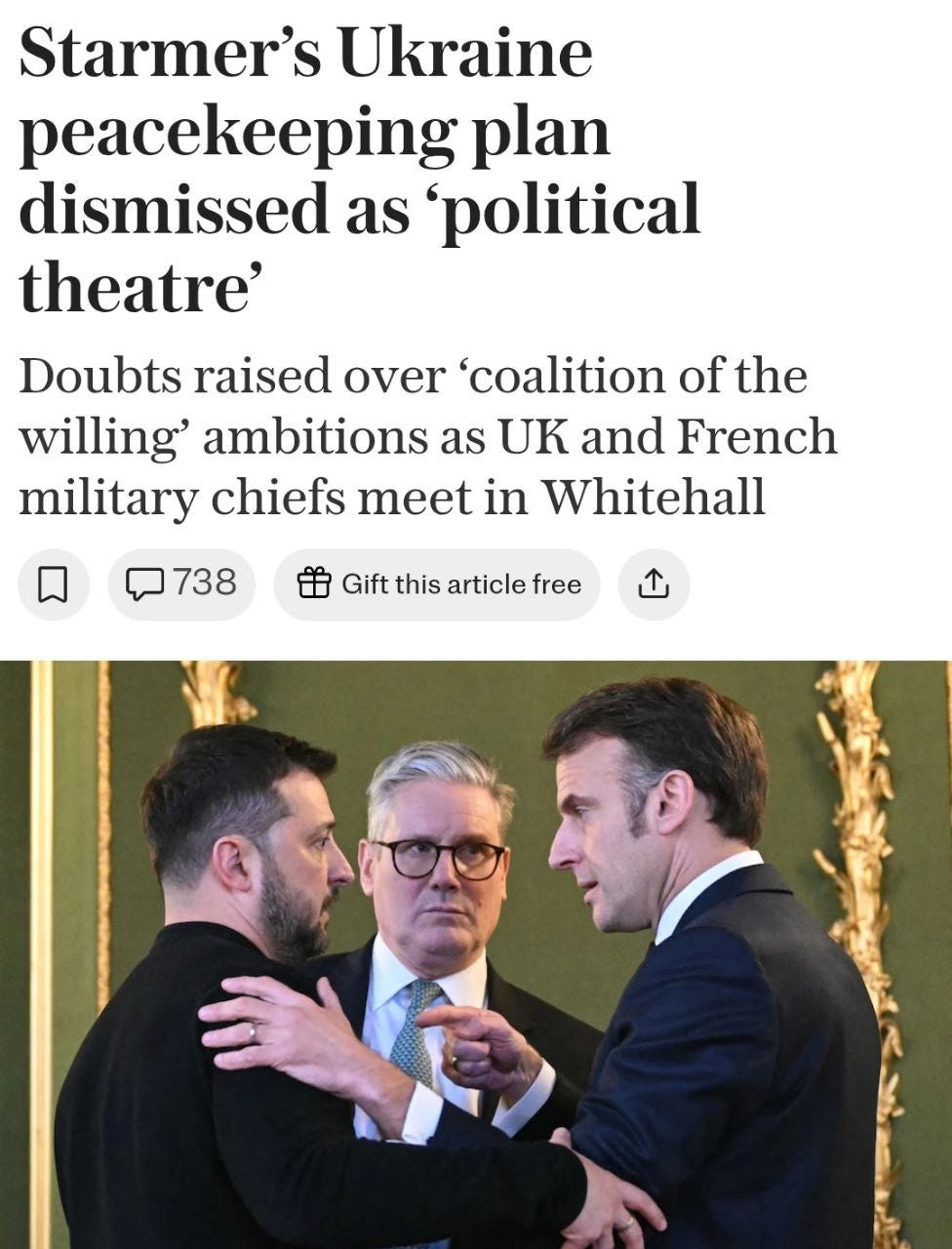 Shortly afterwards, Macron effectively rejected Starmer’s more heavy-handed and belligerent ‘boots-on-ground’ plan, preferring to explore a more—how shall we say—strictly legal, and not off-putting, way to backstop the AFU with European troops. Starmer was getting increasingly gung-ho to the point Macron apparently got cold feet, and realized just how far outside ‘international law’ he was careening. Also, the plan was primarily doomed by US’ refusal to give security guarantees to the Europeans, in the event Russia begins shooting at them.