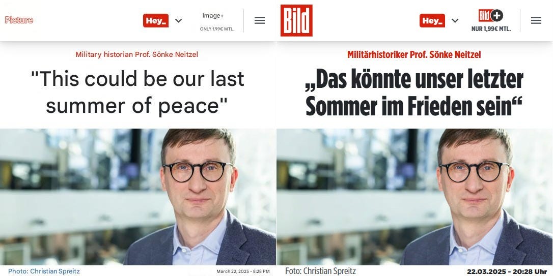 Only after the beginning of the SMO in 2022, voices like those of Sönke Neitzel grew louder to rearm the Bundeswehr, but the German leadership thought it be more profitable and effective to arm Ukraine by disarming Bundeswehr, while at the same time betting all hope on Rheinmetall to increase production.