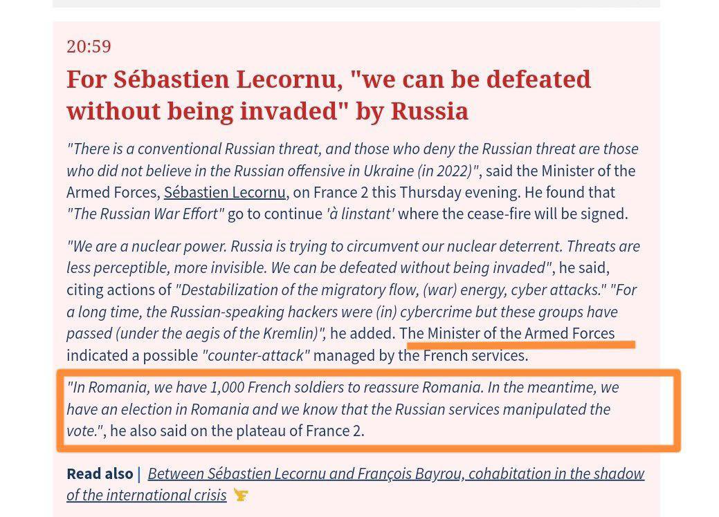 French Minister of the Armed Forces Sebastien Lecornu admitted that France has troops stationed in Romania prepped and ready to heed the call:
