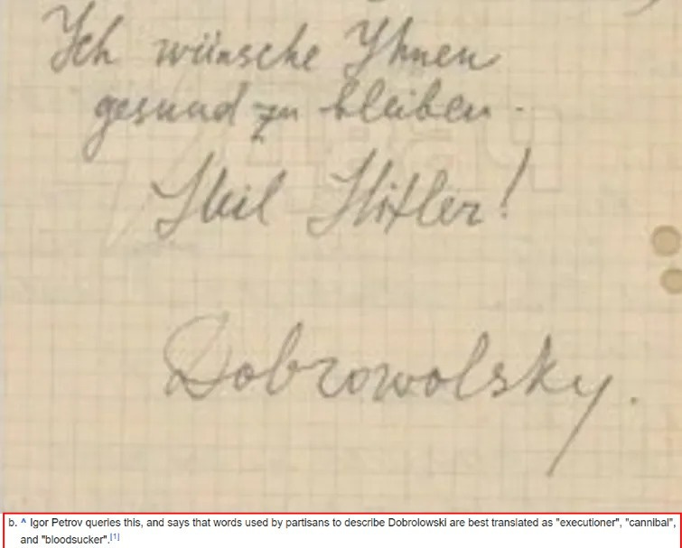 Having returned to his home district of Sosnytsia, he organised a 300-strong Ukrainian police unit which assisted in rounding up and killing Jews and Ukrainian partisans. He rose to become a local intelligence chief for the Nazis in Chernigov, having first collaborated with the Hiwi, before joining the Wehrmacht‘s secret military police Geheime Feldpolizei in July 1942. He was dubbed “the “Butcher” by partisans, and there are accounts of him sharing in loot taken from Holocaust victims and condoning the rape of women prisoners. The Soviets offered a 50,000-ruble bounty—£200,000 today—on Dobrowolski, calling him “the worst enemy of the Ukrainian people.” The last entry in the file is in August 1943, as the Soviet army advanced on the region.