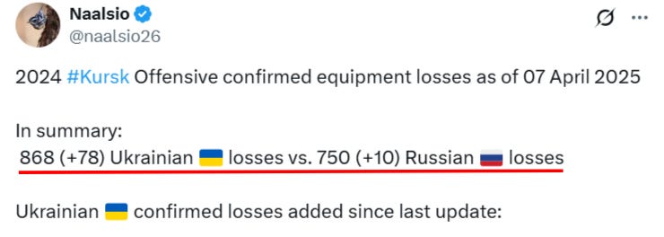 By the way, on that note, a member of Oryx’s team has given an update to the tally of vehicles lost in the Kursk offensive: