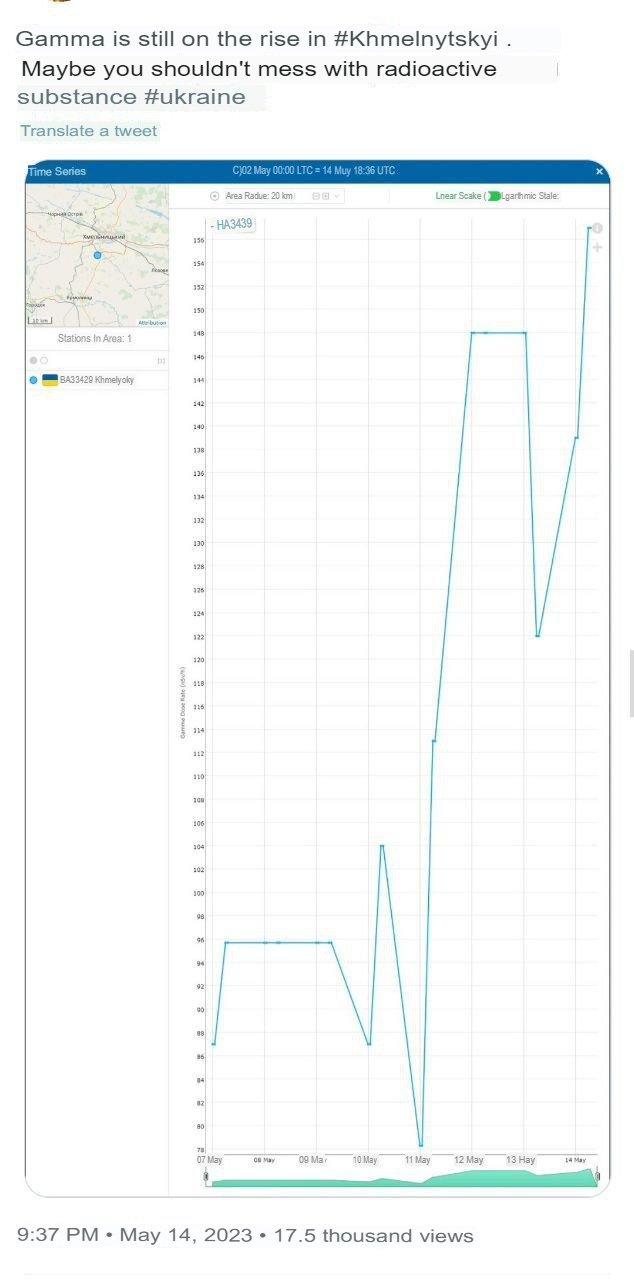 Considering how little gamma radiation comes from depleted uranium, this clear spike in gamma radiation in Khmelnitsky indicates that there was very large stockpile of the DU munitions that was destroyed, raising the uranium dust into the air.