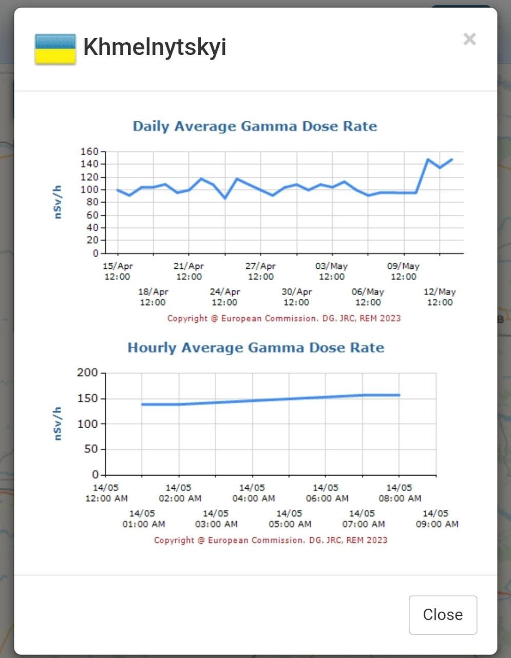 A clear spike in gamma radiation was detected in Khmelnitsky on or about May 12th, with emission continuing to rise the following day and remaining at the elevated level thereafter.