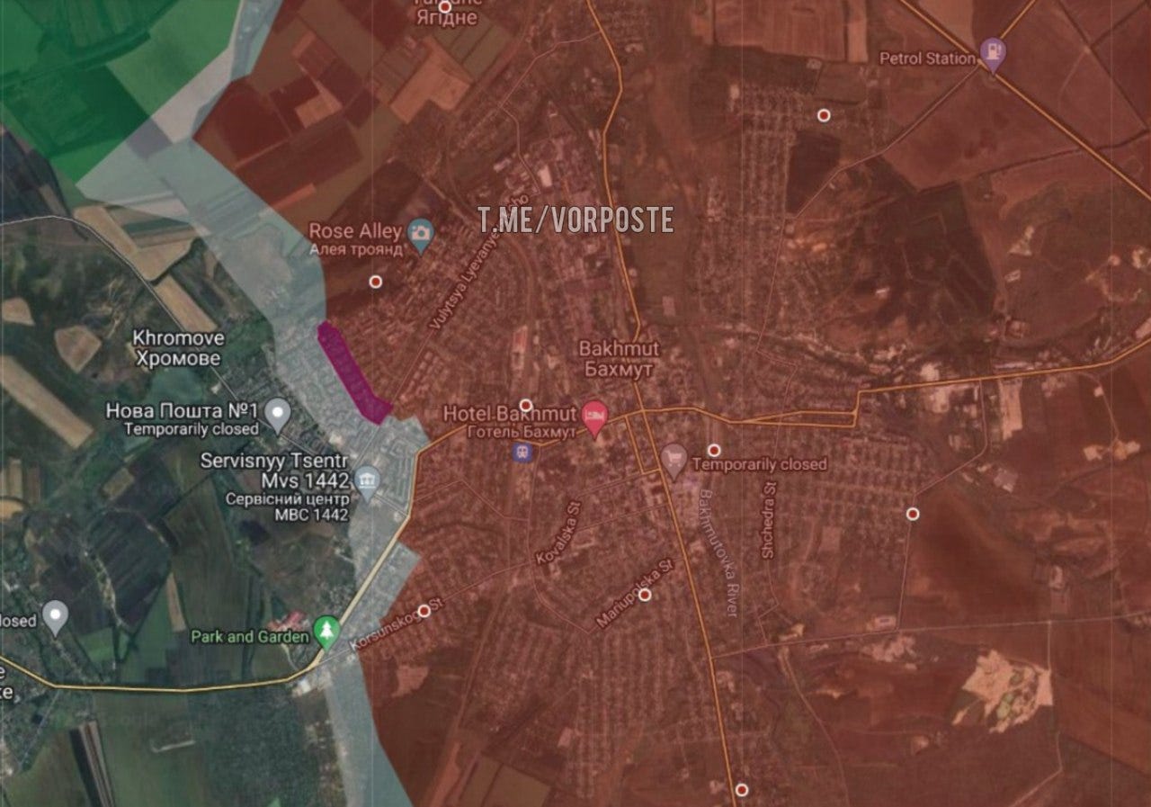 As a last update for today, despite Prigozhin’s ceaseless whinging, Wagner has again advanced in Bakhmut’s final districts:
