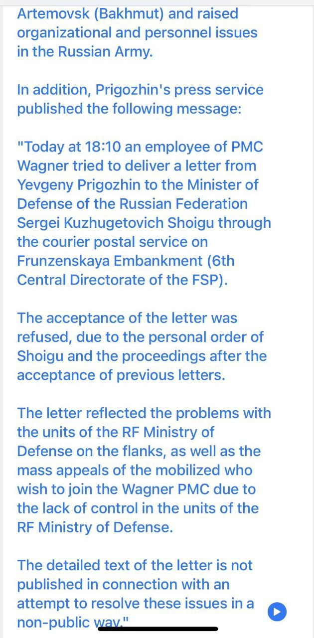 On that topic, a few updates. Prigozhin continues to claim major friction with Russian MOD: