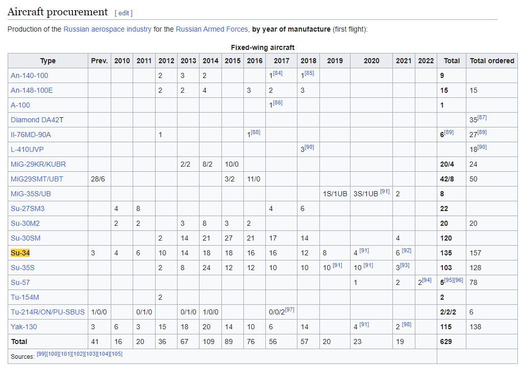 Taking Oryx’s list as a baseline example—even if it’s exaggerated—he has 20 Russian Su-34s lost, and 3 Russian Su-35s total in the SMO so far. As can be seen here, Russia can make up the losses of those 20 x Su-34s in just a single year of normal production, not even counting ramp ups. That means it can be safe to assume that Russia has already not only long made up for the Su-34 losses of the SMO, but is likely exceeding them with new production. Even if Russia only ramped up its previous production ‘slightly’ from 18 per year to 20-30, it would have already more than made up for any losses.