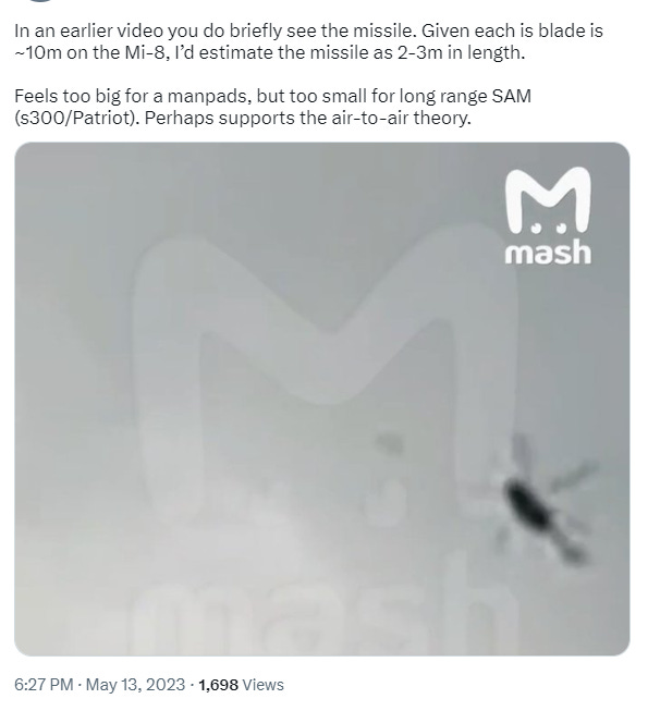Both S-300 and BUK missiles are upwards of 7 meters long. That means, if the helicopter’s rotor blades are 10m in the above photo, the missile should appear nearly as long as the blades. Yet the small blip seems 1/3 the size, which would to me actually point to an Aim-120 from the NASAMs/SLAMRAAM platform. It certainly is too large for Manpad, which would be nearly invisible on camera as they are very small.