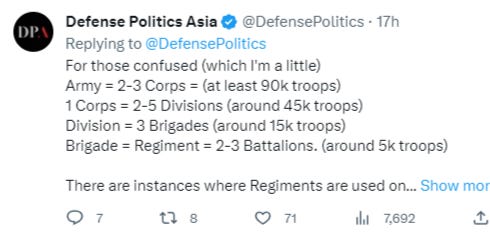 An army can be comprised of 2-3 corps of ~90k troops and a corps upwards of 45k. Five regiments would be about 5k+, so these combined make approximately 150k, which is exactly the new number Shoigu just recruited this entire year. There is no exact statement or indication that the newly recruited are to be used for this purpose but the numbers add up and seem to indicate this.