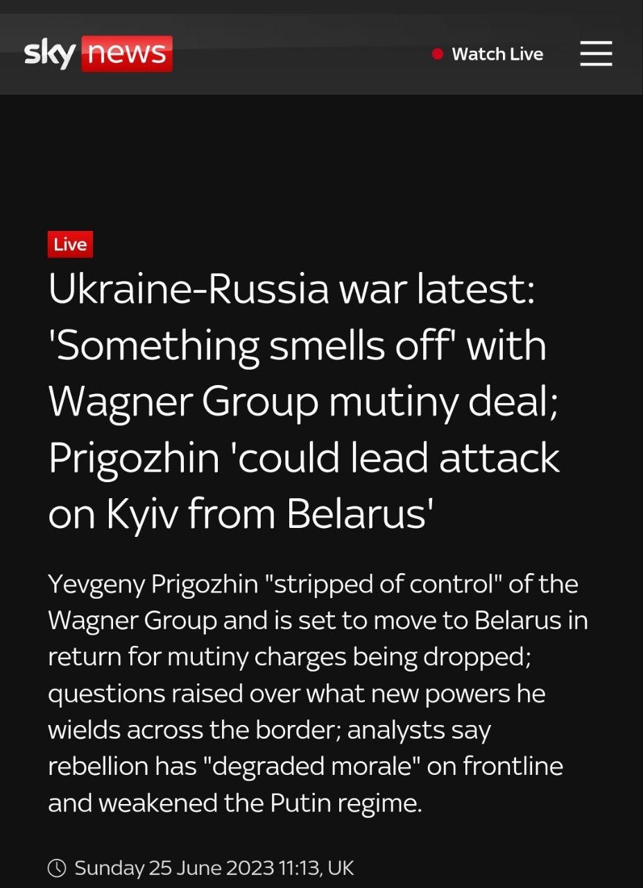 Which leads me to this next analyst’s take. It may be long but very powerful, so please read it. Pay particular attention to the very plausible theory that Prigozhin staged all the lies about ammo in order to secretly stockpile ammo for the very task of taking the Kremlin, not to mention the stunning angle that he specifically waited for this very moment to strike just when the Russian army would be at its most bogged down during the AFU’s offensive: