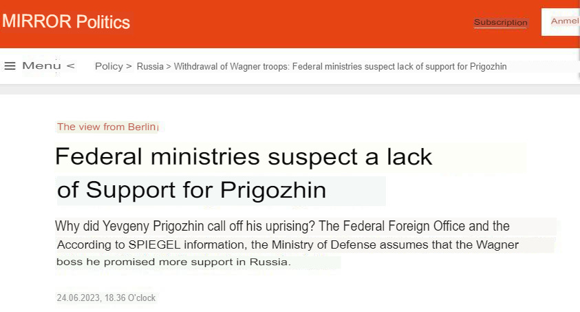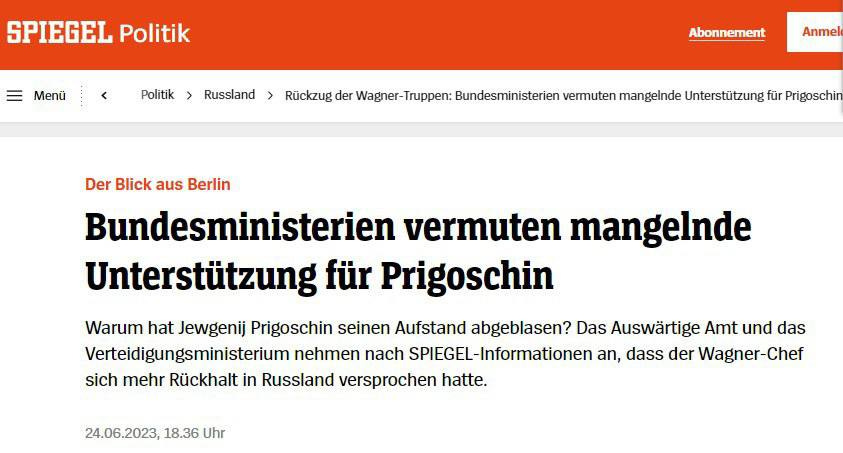 ▪️According to Spiegel, during the briefing, Foreign Ministry Political Director Terven Bellmann and Parliamentary Secretary of State for Defense Zimtje Meller expressed the opinion that Prigozhin did not receive the support he hoped for from the Russian state forces in the coup attempt, and therefore stopped the march on Moscow.