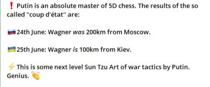 He spread the news that the Russian army is collapsing - because that is what he wanted, a retreating Russian army and a nation looking for some one to blame. If the defensive lines were rolled up, we all would have been outraged here, and many people would be thinking whom is responsible. In this situation, Prigozin steps in and leads his Wagner heroes to stabilize the nation. A saviour. A man that rescues the day.