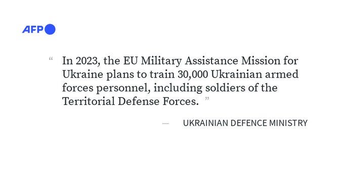 I’ll also mention that recently some have propounded the idea that Ukraine can’t run out of manpower because a constant stream of troops are being trained in NATO countries to replace what they’re losing on the front. I’ve already stated that these amount to only 2-3k per month or less, yet Ukraine is losing upwards of 5-10k per month, so they’re still in a large deficit. But now there’s been a new confirmation, as the EU has released a statement that they plan to train a total of 30k new UA troops for the entirety of 2023: