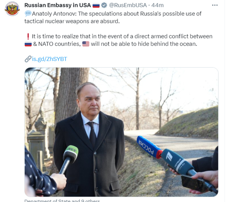 The official Russian embassy account, quoting Russian envoy to the U.S., fired back, stating that in the event of a conflict between Russia and NATO, the U.S. would not be able to “hide behind the ocean”, clearly referencing nuclear strikes:
