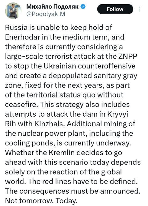 Ukrainian presidential advisor Podolyak added to the orchestrated release with his own statement, slowly conditioning the narrative that Russia is losing its grip on Energodar and will blow the plant to “stop the Ukrainian counter-offensive”.