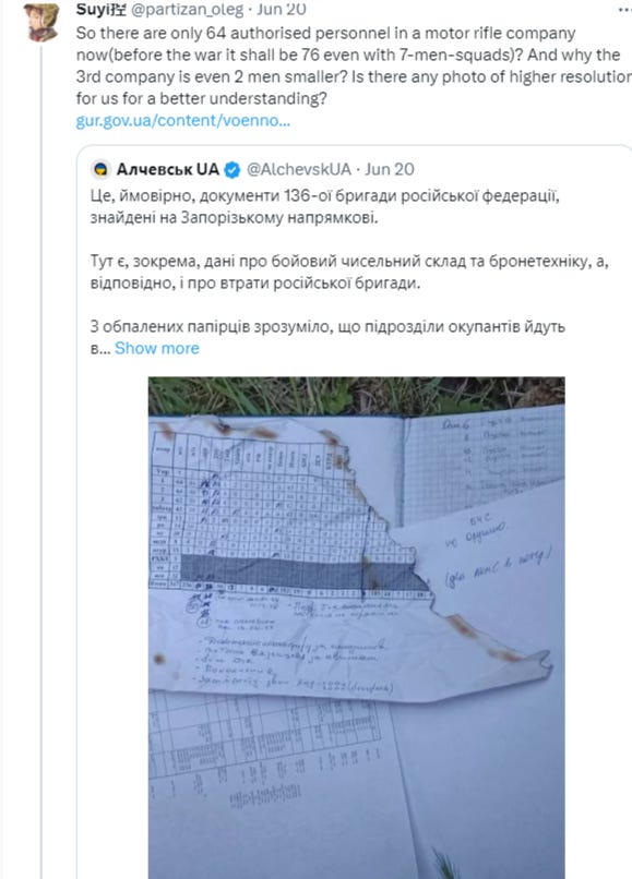 As for the AFU, let me repeat that the Pentagon leaks had them at about 60 total brigades. Data has shown most of their brigades are under-manned so taking anywhere from 3-4k as a base average, we can get a figure of around 180-240k men. However, this was from the beginning of the year, prior to most of the brutal Bakhmut slaughter as well as the recent offensive losses. They could have lost upwards of 40-60k more men in that time. Thus, even if you take the higher brigade denominator of 4000 men = 240k, then currently the AFU total would be well under 200k.