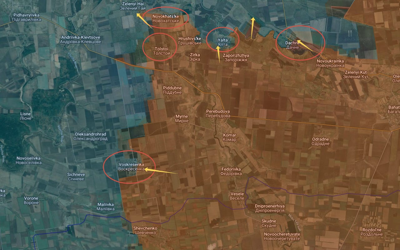 Up north, however, they had success and captured both Tolstoi and most or all—by some accounts—of Novokhatske. Dachne was also mostly taken, while Yalta was taken but again recovered by the AFU in a counterattack. Note that Myrne was also taken just days ago, and now all the fields to its west have been captured to flatten out the line between Voskresenka and Novokhatske.