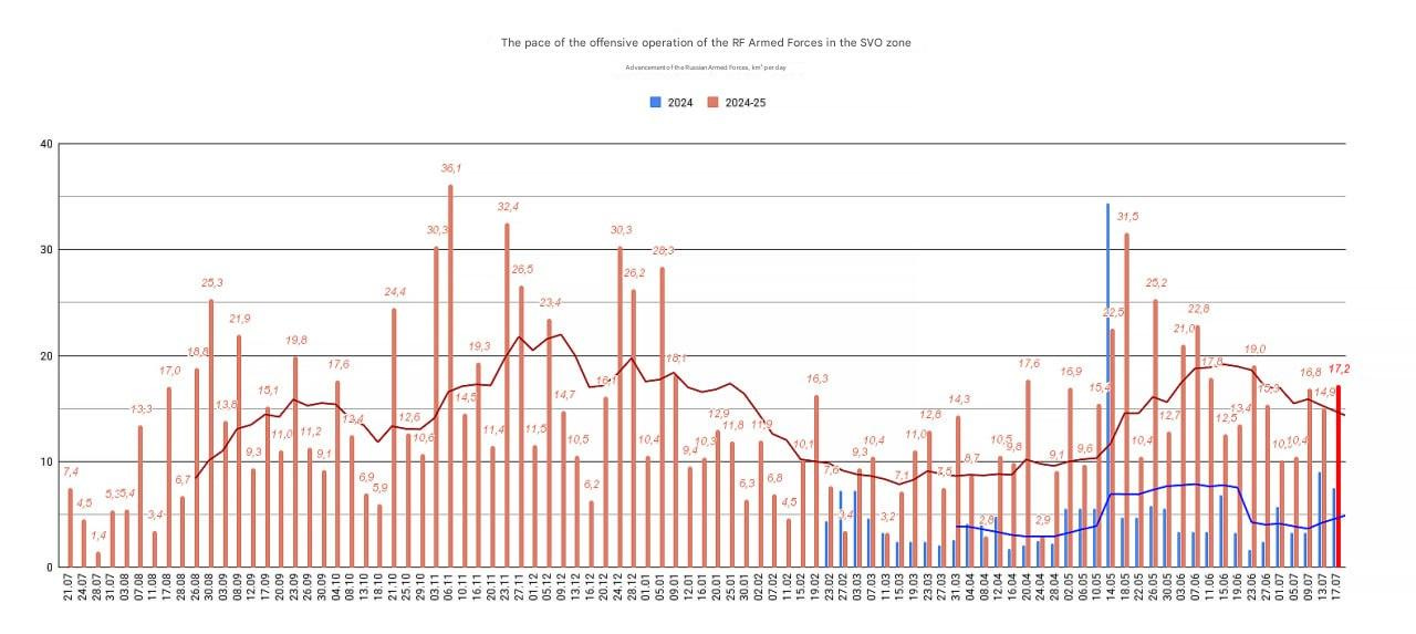 The problem is, Russian advances are not linear, but rather they are going exponential on a yearly scale. This year they are already double that of last year, and given Ukraine’s terminal decline in resources and manpower, it can be expected that they may continue to multiply this way.