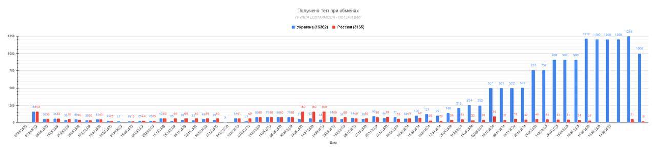 In fact, another round of new body exchanges has shown casualty disparities continuing in the stratospheric range, as Russia gave back 1,000 new bodies to Ukraine, and received 19 in return: