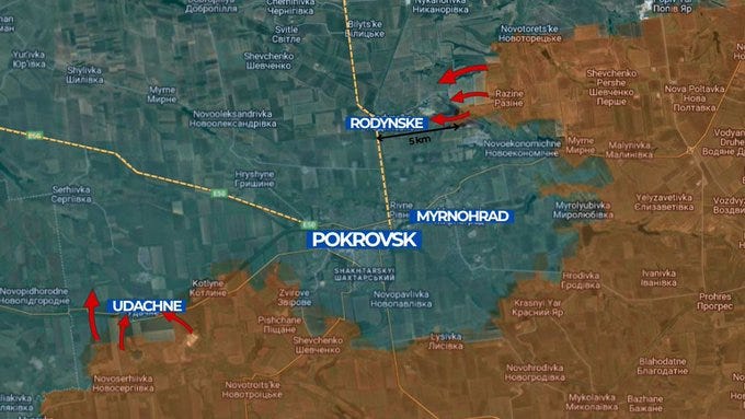 In the area of the Pokrovsk-Mirnograd agglomeration, not much has changed other than Russian forces have fully established themselves on the outskirts of the key center of Rodinske such that cautious map-makers have finally penciled it in: