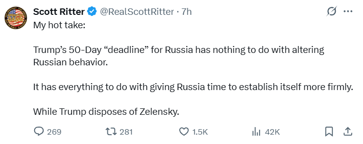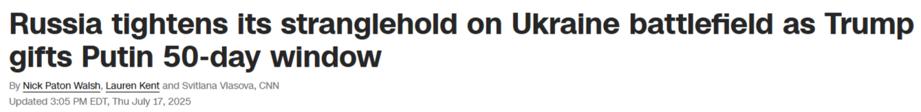 The above may have the right idea. At this point, Trump’s only real imperative is to create perceptions of strength and success in the public eye, and particularly for his opponents in the media. To one extent it, it relates to feeding his ego, and to another it’s simply a consequence of his realization that there’s nothing he can really do to end the war, and so the only remaining impulse is to make sure whatever happens can at least be spun as a personal victory. The 50-day window buys time to allow Trump to look tough with the threat of harsh sanctions, without actually having to follow through with them, in hopes something will flip the calculus by then and save him from having to commit to impossible promises. In short, a wayward, rudderless foreign policy, as always.