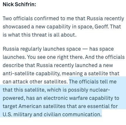 NewsHour reporting that the Russian mystery weapon may be a nuclear-POWERED (not a nuclear-armed) anti-satellite system. If so, it could be highly effective, though also grossly irresponsible.