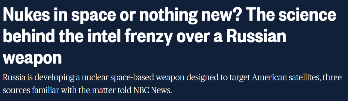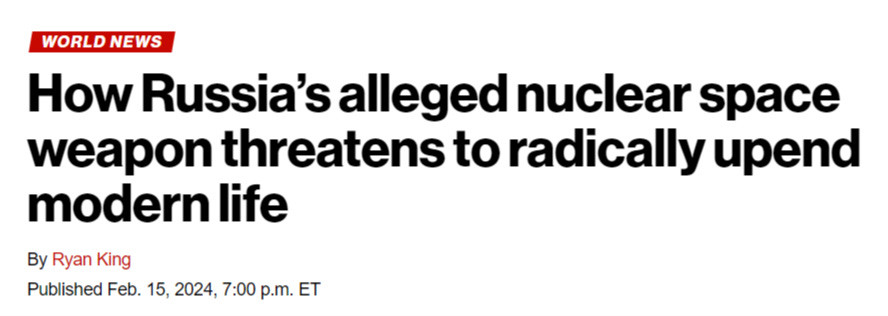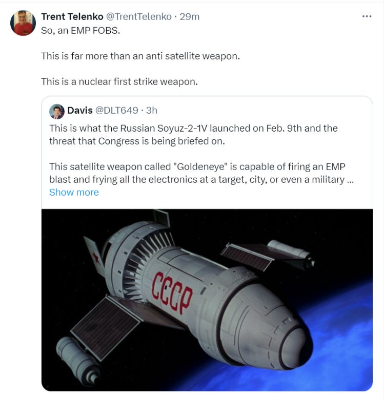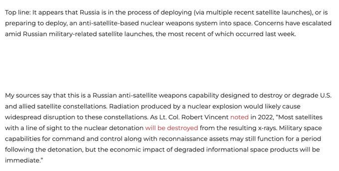 1. The entire story is either fake or exaggerated and being rolled out by Democrats at a strategic time to achieve several purposes: scaremongering Congressmen into voting on Ukraine aid, as well as potentially conditioning the masses and setting the stage for a black swan falseflag to cancel the 2024 elections later this year. What better way to do a ‘mail-in voting hoax’ redux than to claim a secret Russian nuclear satellite “disabled” all communications and thus voting machines, allowing the deepstate to either fiddle with the results or outright cancel/postpone elections if things are getting dire for them.