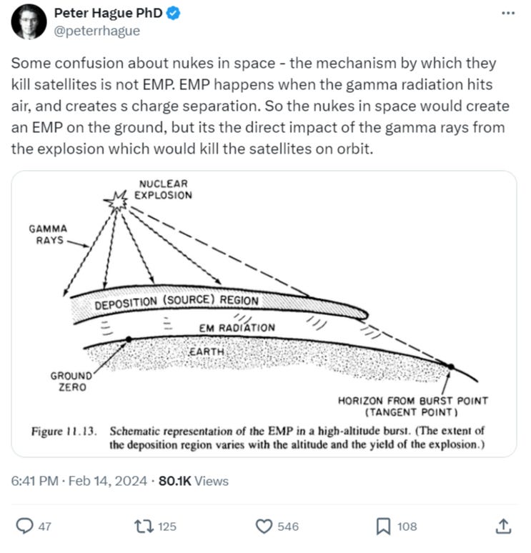Here’s another account writing on Russian ‘Super-EMP’ capabilities. And this astrophysicist clarifies a bit of semantics in that ‘EMP’ is not precisely the effect that kills other objects in space: