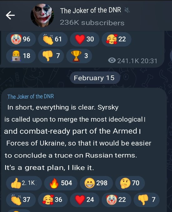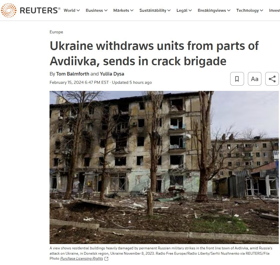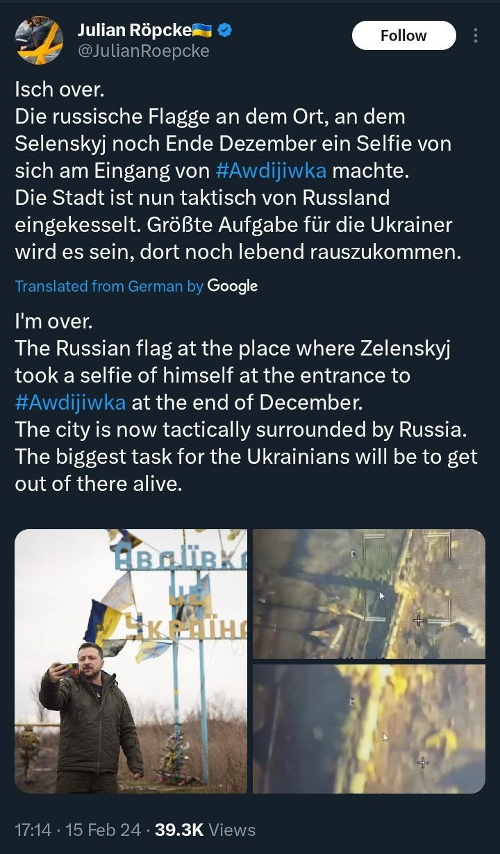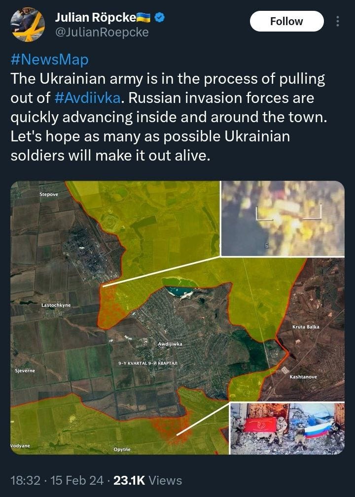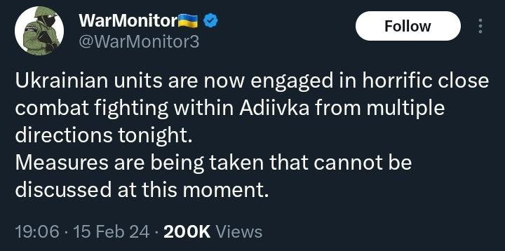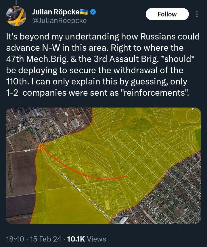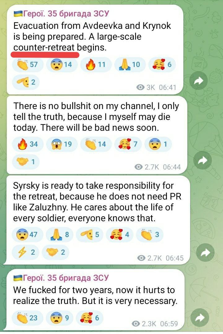The headquarters inside Avdeevka received a directive to withdraw along three “logistics corridors.” The key role was played by the commanders of the 3rd “Azov” brigade of the Ukrainian Armed Forces; after entering, they quickly understood the situation, lost one and a half battalions and decided to leave “due to the lack of positions and logistics routes prepared for defense.” (there were also reports on TG channels about Ukrainian soldiers leaving position without permission in the very eastern part of the cauldron - I think what we see now is a sort of narrative damage control - Russian sources also report: We won't let them leave - they can surrender or they will die - there is no escape)