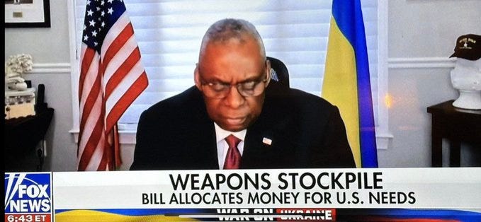 Meanwhile half-conscious Floyd conspicuously sported a Ukrainian flag in his hospital roo—I mean ‘Pentagon office suite’: