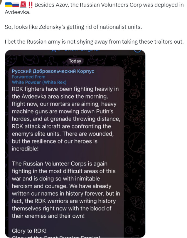 A final interesting aspect of ongoing events is the brewing theory, posited by the famed hackers of DPR Joker and others, that the most rabid ‘nationalistic’ formations were in fact ‘fed’ into the grinder of Avdeevka for a very specific purpose. According to the theory, Syrsky was onboarded precisely to help ‘destroy’ the nationalist groups that Zaluzhny husbanded and cultivated in order to facilitate the proper conditions for an ensuing negotiations or surrender—which the nationalist groups would not have allowed, were they at full strength: