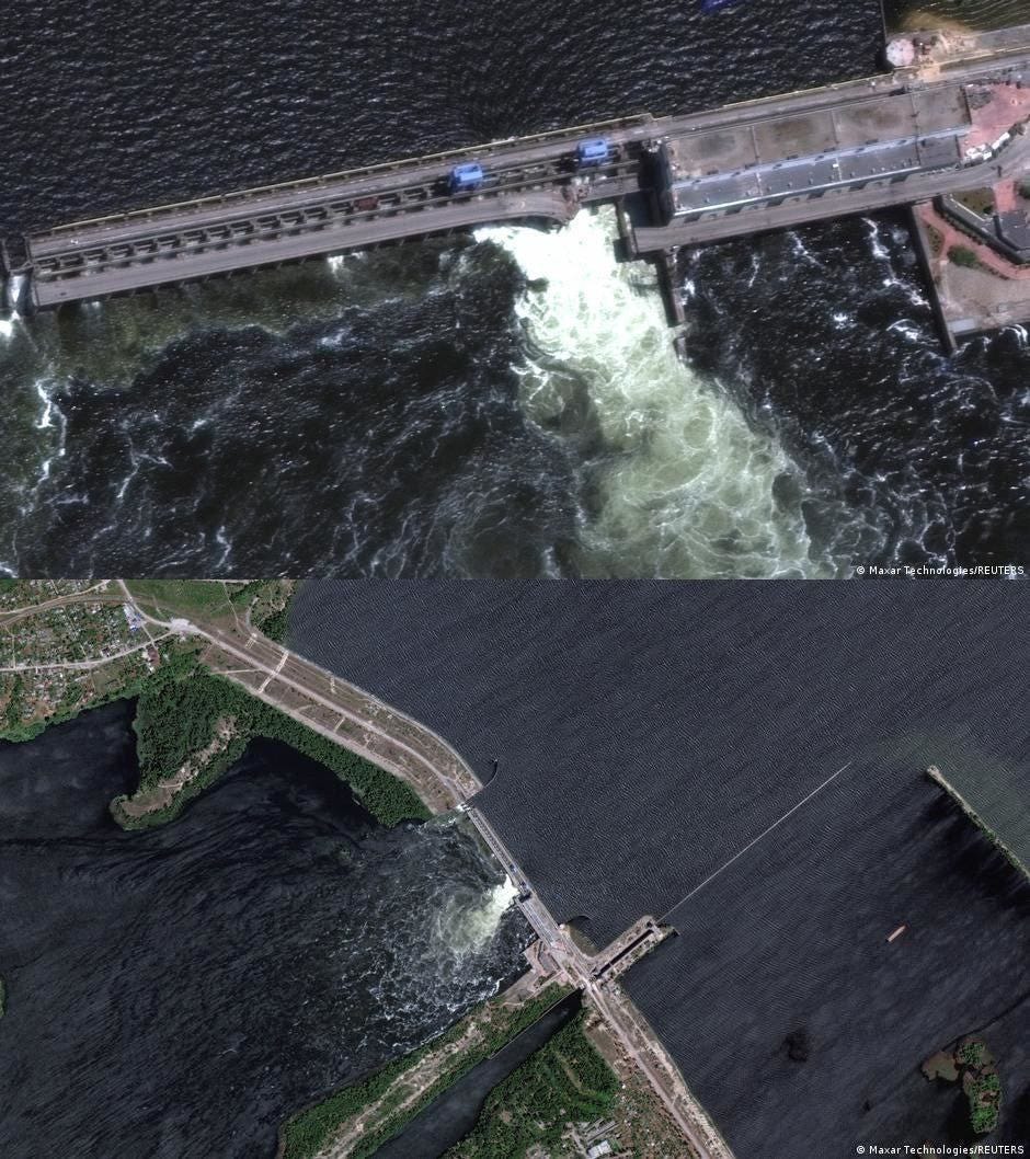 Firstly, satellite photos were released showing that the dam had already been massively leaking at the center in the days leading up to the breach: