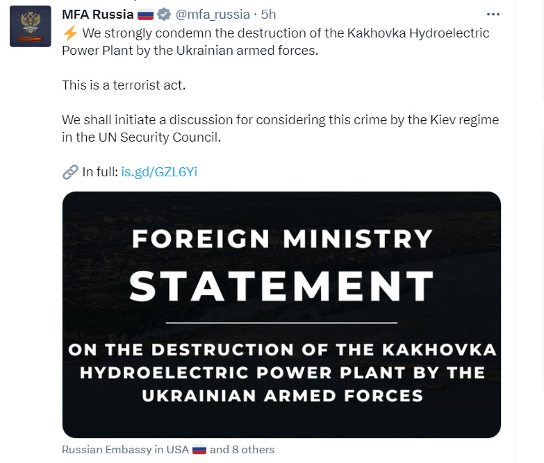 To be honest, given the evidence above, it does seem to me the much more likely culprit was this ‘semi-natural’ method, but the blame would still fall on Ukraine for having facilitated it by pumping up the Kakhovka reservoir from upstream. So, if you asked me to name my most likely culprit from the three choices above, I’d likely go with this one. But Russia appears to be doubling down on their accusations of Ukraine, as not only did Shoigu release the statement accusing Ukraine of being responsible but Russia’s ambassador to the UN, Vasily Nebenzya even pressed the UN to condemn Ukraine for the ‘terror action’: