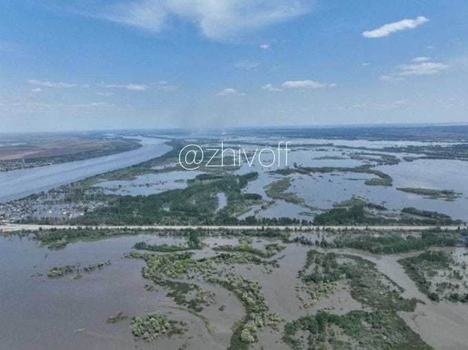 That mostly covers the dam situation. The only things to add are some media of the consequences. Note that the Russian side of the river suffered the worst of it, particularly the town of Kakhovka, which as I said before, was known all along, as the unique geography there simply makes Russia’s side more vulnerable to the flooding. Which, again, is a point against the theory that Russia did it: