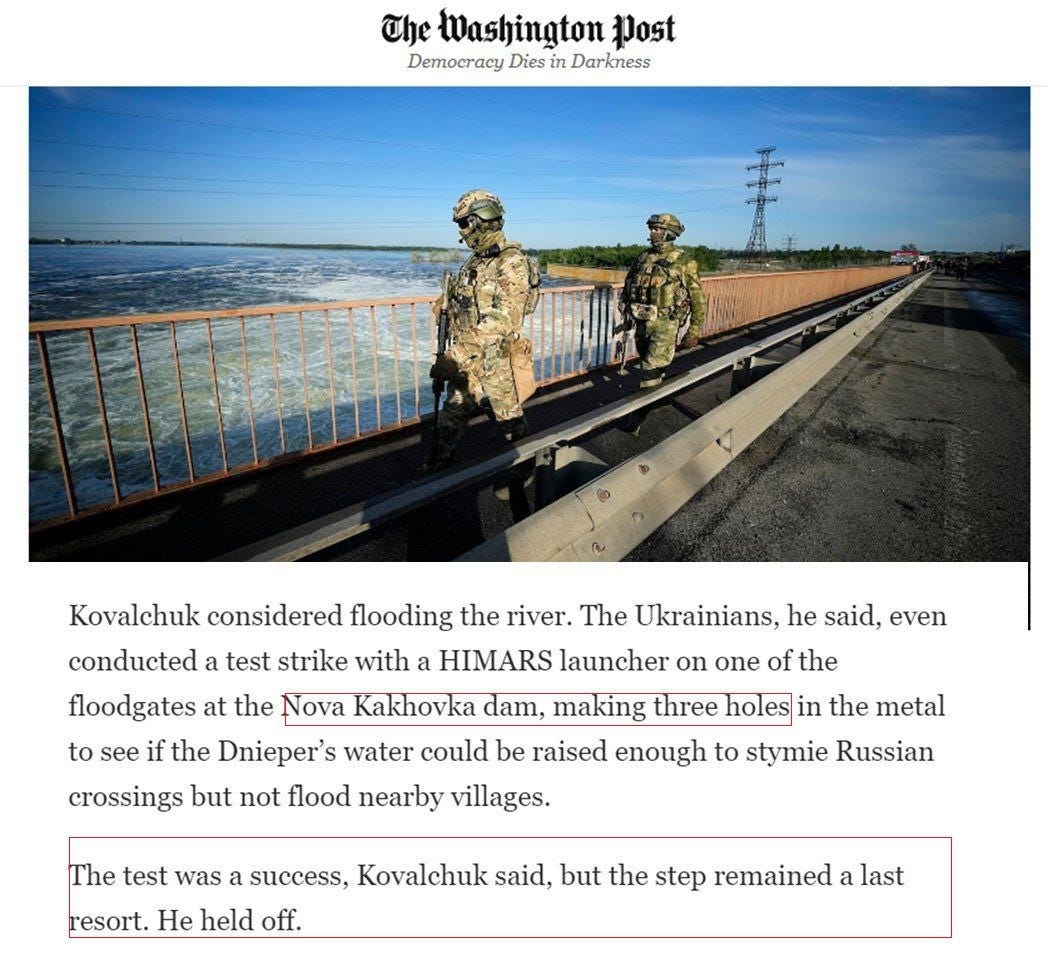 Many are sharing this WashPost article, for instance, where Ukraine’s major general Andrey Kovalchuk admitted to striking the dam with HIMARs to test their ability to hit it so they can have that in their pocket as a potential plan to cut off Russian forces:
